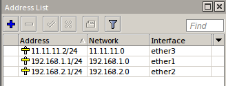 Sehingga hasil akhir dari pemberian ip address adalah seperti pada gambar dibawah ini.[admin@IDN_R1] > ip address add address=192.168.1.1/24 interface=ether1 [admin@IDN_R1] > ip address add address=192.168.2.1/24 interface=ether2 [admin@IDN_R1] > ip address add address=11.11.11.2/24 interface=ether3